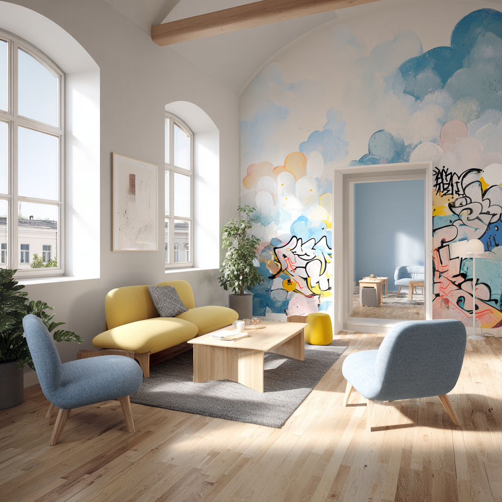 Yhteisiin tiloihin suunniteltiin myös tarinallisia visuaalisia elementtejä, joissa taivaansiniset ja kirkkaammat sävyt symboloivat vapautta ja toivoa. Visuaalinen kokonaisuus tukee tilojen identiteettiä ja luo ympäristön, jossa käyttäjien on mahdollista rauhoittua, kohdata muita ja rakentaa arkea.